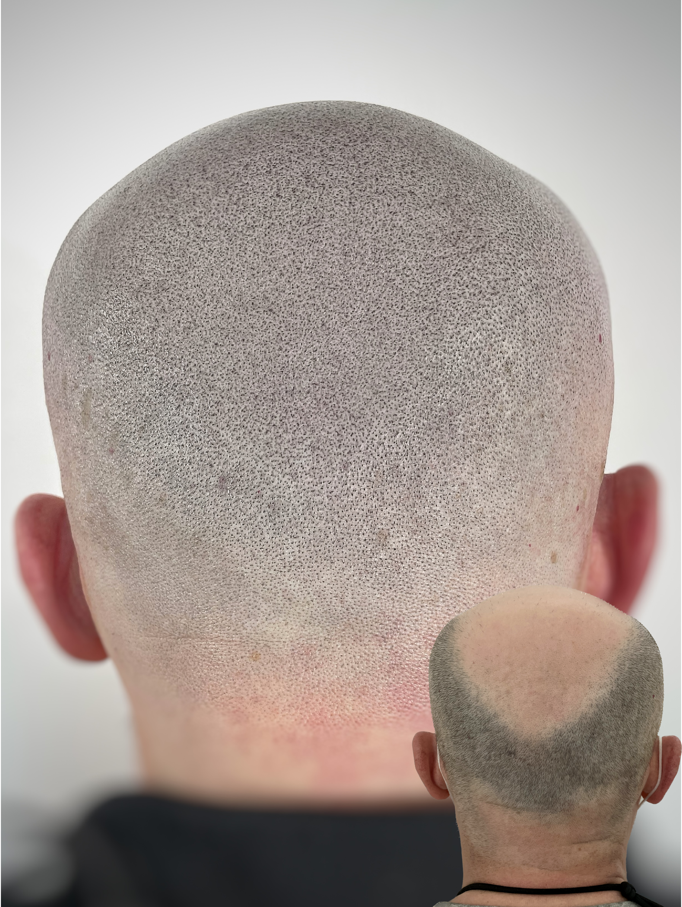 The small dots, made with vegan and organic pigments, mimic the appearance of hair follicles, giving the impression of a closely shaved or buzzed hairstyle.